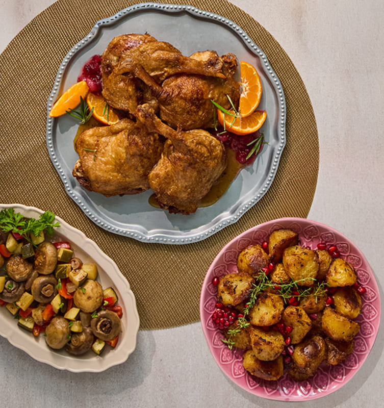 Tender, slow-cooked Duck Legs prepared in Classic French confit style, served with Crispy Duck Fat Roasted Potatoes and Savoury Mushroom Salad. A rich and elegant meal.